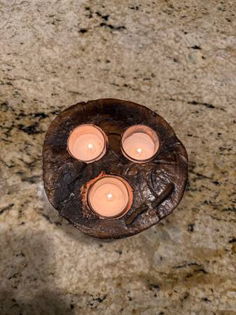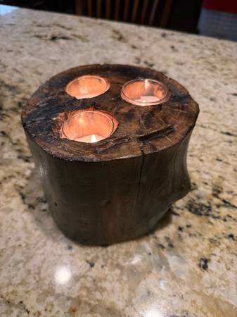 Real Elm wood, handmade, rustic candle holder. Holds 3 ea. 2” tea light candles. One of a kind, others available in many different shapes and sizes. Cash only.
