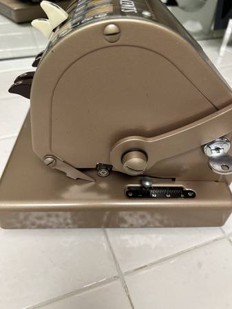 PAYMASTER CHECK PROTECTOR - $15.00 This machine protects your checks from forgery or illegal changes to amount. You set the amount of your check, then print the amount. See enlarged photo of check....