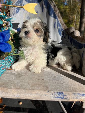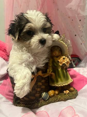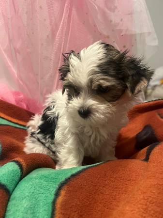 Beautiful colored parti make yorkie pup. Rehoming fee and not cheap. Does have papers.