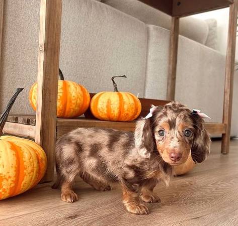 Beautiful Dachshund pups 8 weeks old. AKC registered, first shots and deworming. Rehoming fee